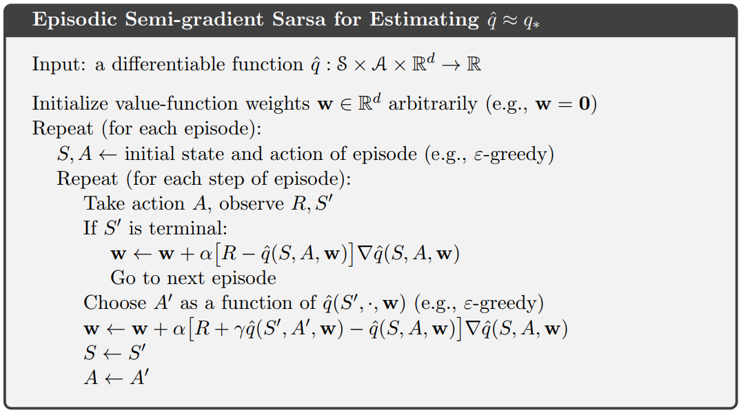 在尝试实现Episodic Semi-gradient Sarsa with神经网络作为逼近器时,我想知道如何根据当前学习到的网络权重来选择最优动作。如果动作空间是离散的,我只需计算当前状态下不同动作的估计值,就可以选择给出最大值的动作。但这似乎不是解决问题的最佳办法。此外,如果动作空间可以是连续的(例如,自动驾驶汽车的加速),则不起作用。