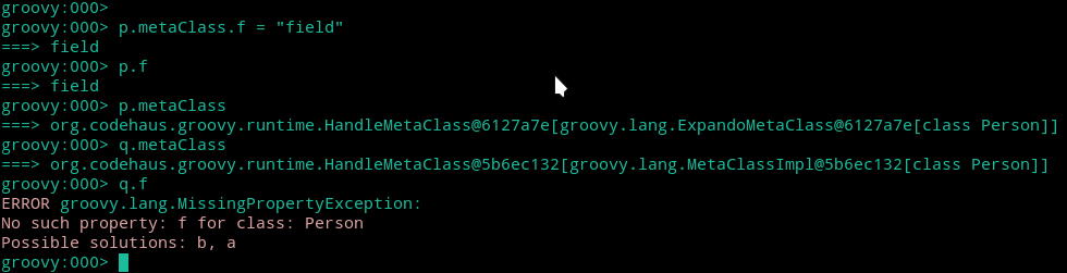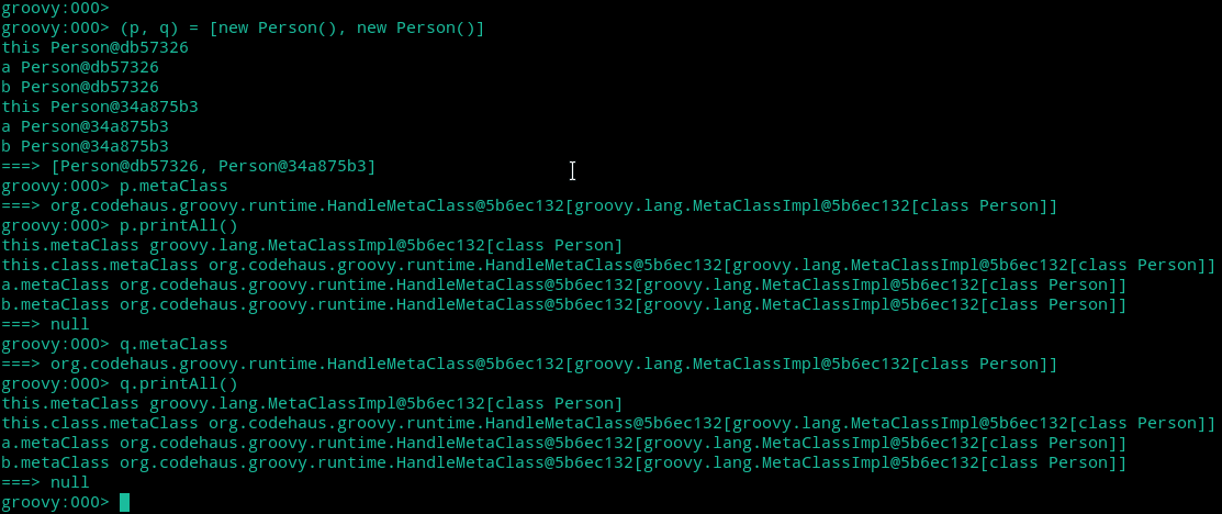 p和q是两个不同的对象,但是p.metaClass与q.metaClass相同,并且printAll为p和q打印完全相同的内容a.metaClass和b.metaClass持有this.class.metaClass,而不是this.metaClass,你看只有一个由MetaClassImpl创建的对象,也只有一个用于Person的HandleMetaClass对象。不管您实例化Person多少次,它们都将被分配给实例。但是,当您展开其中的任何一个实例时,只有在那时才会创建一个新的HandleMetaClass对象--只针对这个特定的对象;而这次,HandleMetaClass将保持的不是MetaClassImpl,而是ExpandoMetaClass。