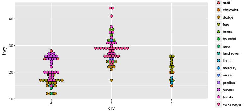 使用来自包ggbeeswarm的geom_beeswarm是一个选项。它并不是用同样的方式对偶数行点进行居中,但是点颜色似乎比geom_dotplot更好。