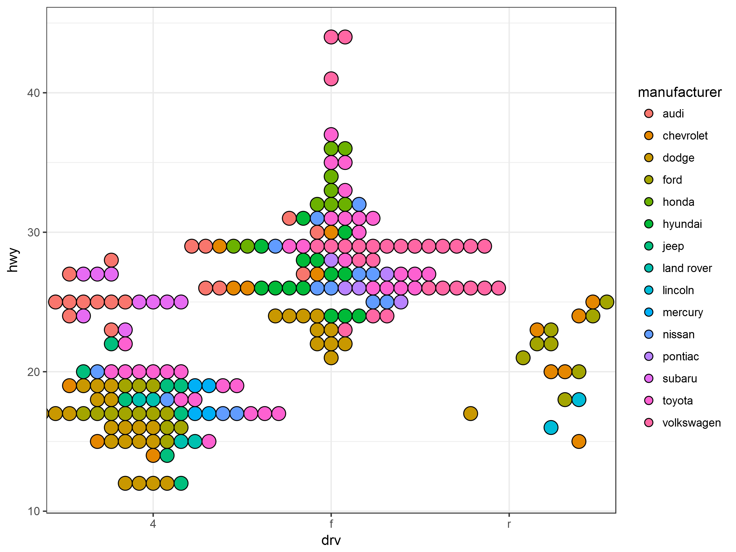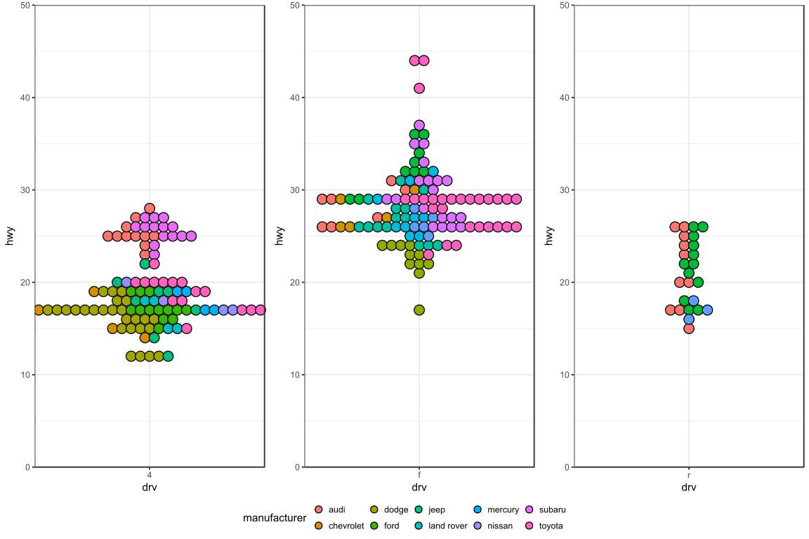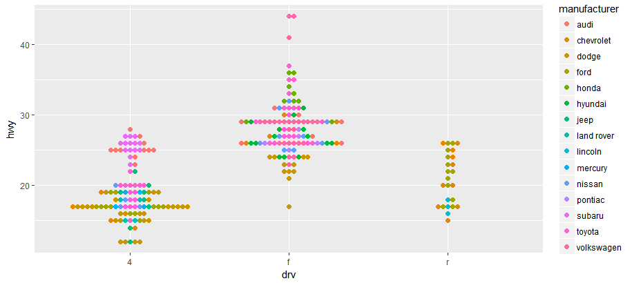 ggplot(mpg, aes(drv, hwy, color = manufacturer)) +