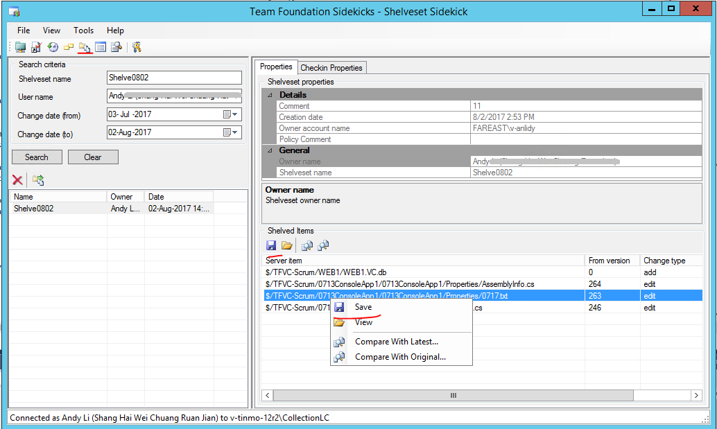 您还可以使用Shelveset Sidekick工具,它允许查看和保存搁置的文件。