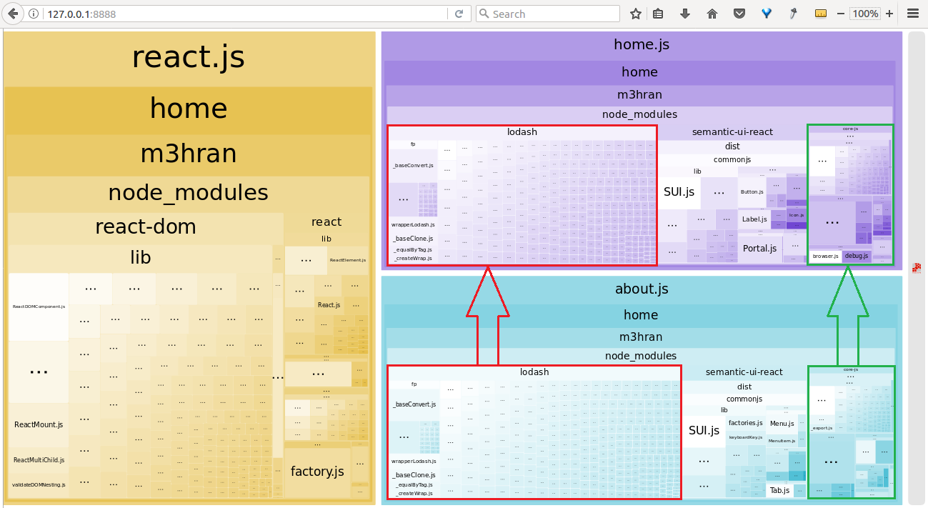 正如你所看到的,有一些重复的代码,一些在红色区域,另一些在绿色区域。我想将这些js代码从家中提取出来,并将其打包到一个单独的包中。为了提取红色区域代码,即库,我在webpack配置中添加了以下行: