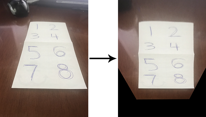 然后创建一个新的cv::Mat与您选择的宽度和高度,,尊重您的纸张的比例,宽度和高度,,并做透视转换。关于这最后一段的指导方针,请看一下这个链接:https://www.learnopencv.com/homography-examples-using-opencv-python-c/#download中的“使用单形的透视校正”一节。简洁的:您要求opencv找到适当的转换,将您的预期论文点投影到一个完美的矩形平面(您的新cv::Mat)。
