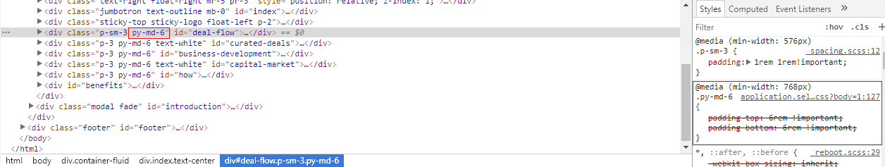 我试着把.py-md-6放在.p-3之前,但它没有起作用。我尝试使用.p-sm-3,但是它是用@media (min-width: 576px)定义的,并且仍然覆盖.py-md-6。
