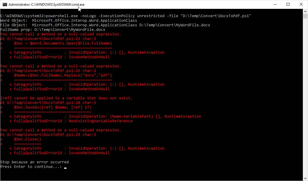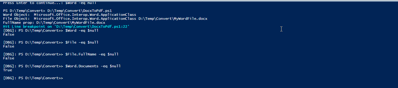 现在,当我知道x32是我使用powershell_ise_x32调试到脚本中的问题时,发现$Word.Documents是null。因此,Powershell-API for Word在x32 PowerShell中有不同的行为,在64位中则不同。