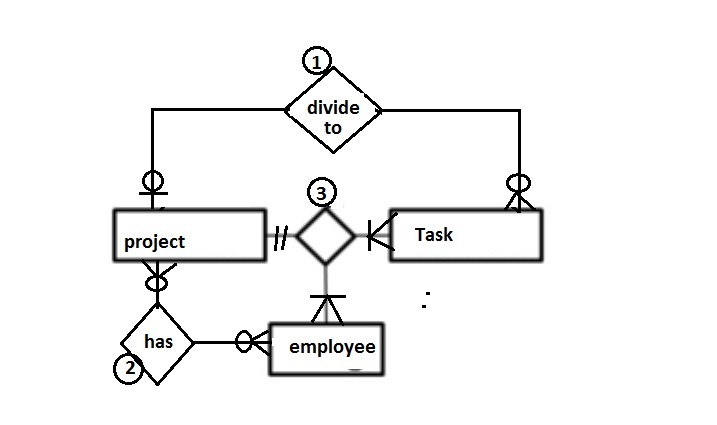 在常识中,您的设计满足一定的约束:如果任务-项目对出现在3中,那么它必须出现在1中,如果员工-项目对出现在3中,那么它必须出现在2中。在ER建模中,反映这一点的一种方法是将任务-项目&雇员-项目关系具体化为关联实体,然后将3替换为ER在这些实体上的二进制关系。就关系而言,关系/表在值上仍然是三元的,其中某些子行恰好标识这些实体。一种获得约束关系二进制3的方法是在2中添加一个employee(主键)或CK (候选键) id,并用这样的id替换3中的复合FK (外键)。然后我们有一个关于实体和值的二进制。一些伪ER方法就是这样做的。