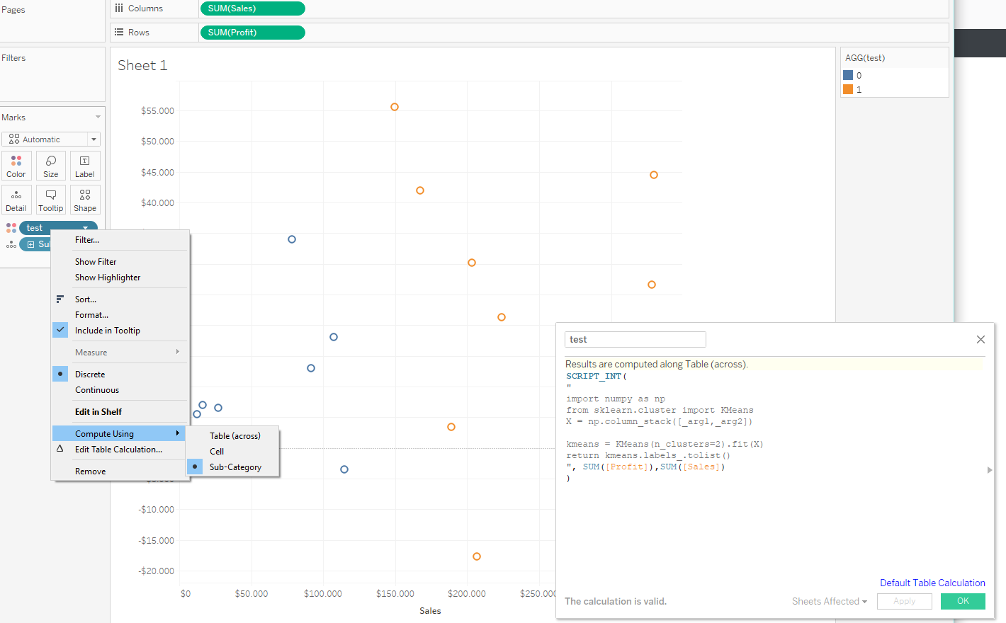 我在使用tabpy时遇到了这个问题。我使用示例超级存储数据集,并希望使用sum(利润)和sum(Sales)对子类别进行聚类,但它返回错误: