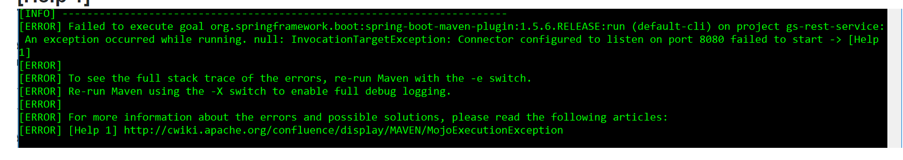 错误未能在项目gs-rest-服务上执行目标org.springframework.boot:spring-boot-maven-plugin:1.5.6.RELEASE:run (默认-cli):运行过程中出现异常。null: InvocationTargetException:配置为侦听端口8080的连接器未能启动->帮助1