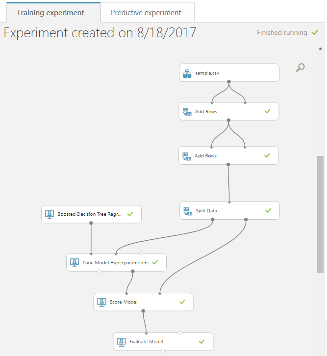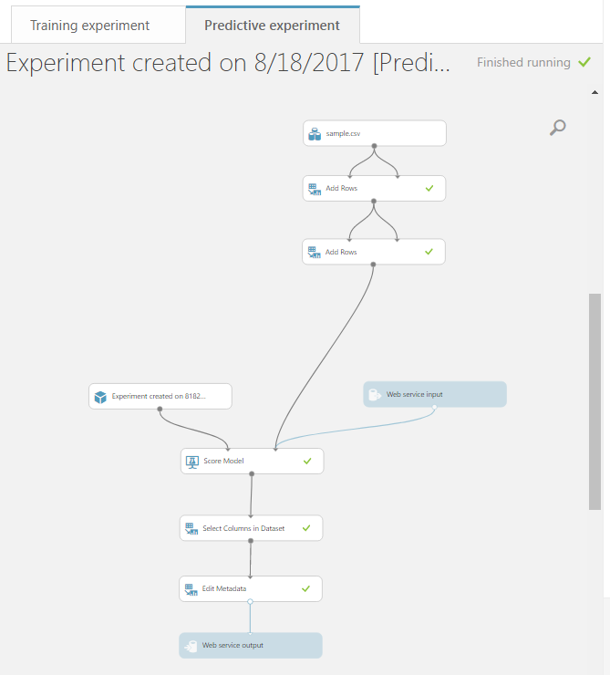 在此之后,要将其部署为web服务,必须首先从培训实验中设置一个预测实验。Setup Web Service > Predictive Experiment你的实验将像魔法一样移动。