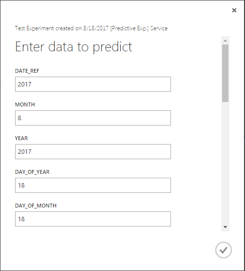 为了预测新值,我使用当前日期详细信息作为输入来测试web服务。(,尽管DATE_REF输入必须是20170818 :D )