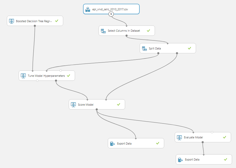 默认情况下, experiment输入模块将放在实验的顶部。I移动它并连接到Score Model的右侧,这样当您输入web服务的参数时,就会使用您经过训练的模型来预测它。