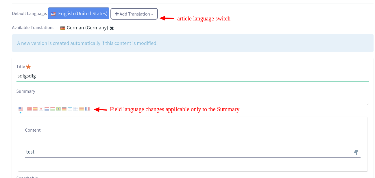 您看不到标志,因为开关功能是由编辑视图顶部的大文章语言开关提供的。如果您在那里更改它,您应该得到您发布的XML或类似的内容。请注意,您没有调整根目录下的可用区域设置。