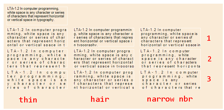 正如您所看到的,对于单行文本,发空间将允许对伪字符间距进行最好的调整;但对于多行文本,则更倾向于使用不间断的空间。不过,它仍将允许在线条前面留出空白。