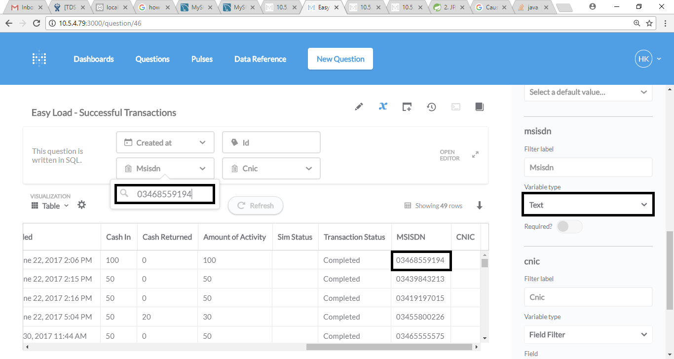 我正在使用metabase与Mysql集成用于报告目的。我浏览了文档,但是找不到任何例子来解释如何在基于SQL的问题中实现过滤器。