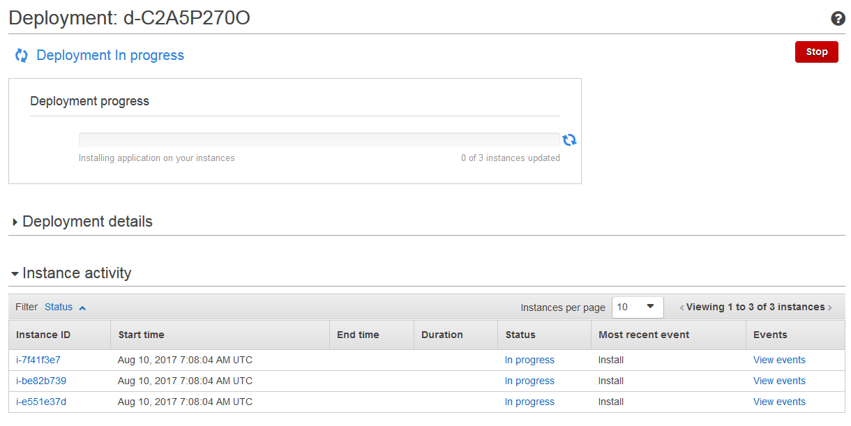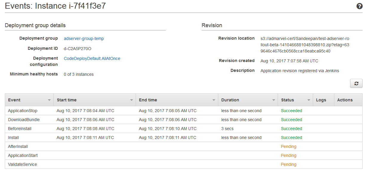 2017-08-21 11:13:47 INFO [codedeploy-agent(1983)]: Version file found in /opt/codedeploy-agent/.version.2017-08-21 11:13:47 INFO [codedeploy-agent(1983)]: [Aws::CodeDeployCommand::Client 200 0.027061 0 retries] get_deployment_specification(deployment_execution_id:"CodeDeploy/us-east-1/Prod/arn:aws:sds:us-east-1:377703961998:deployment/d-W41BWKK7O",host_identifier:"arn:aws:ec2:us-east-1:377703961998:instance/i-e551e37d")发布于 2017-08-18 14:52:32