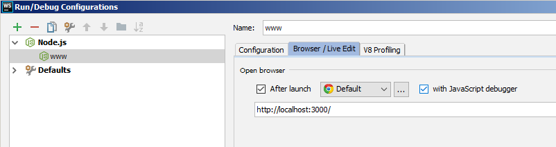 如果使用Node.js运行配置来启动服务器,则可以使用Browser/Live 选项卡在启动服务器时启动客户端调试:只需在那里指定应用程序URL,并在启动后检查和JavaScript调试器选项。