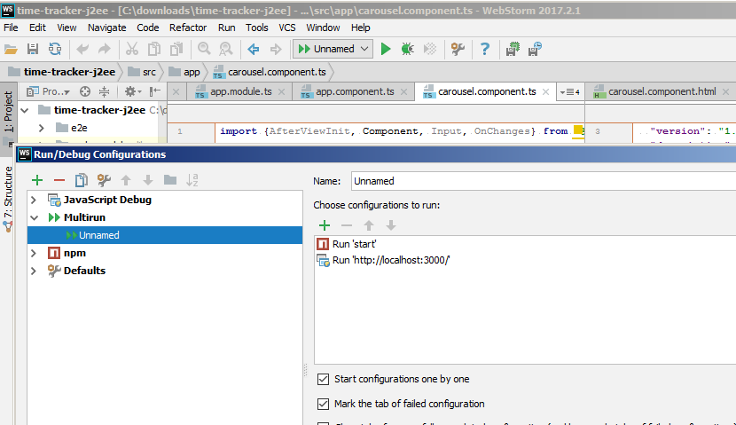 我正在尝试设置一个运行配置,以便同时启动我的前端的Javascript调试和调试。可以手动启动两个调试会话,并且可以工作。但每次改变之后我都得这么做。
