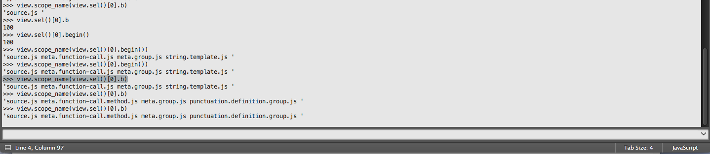 当我创建一个*.崇高-片段时,我需要得到这个作用域。view.scope_name(view.sel()[0].b)命令是我偶然发现的,ST2控制台可以方便地输出当前选择的选项卡的作用域名称。