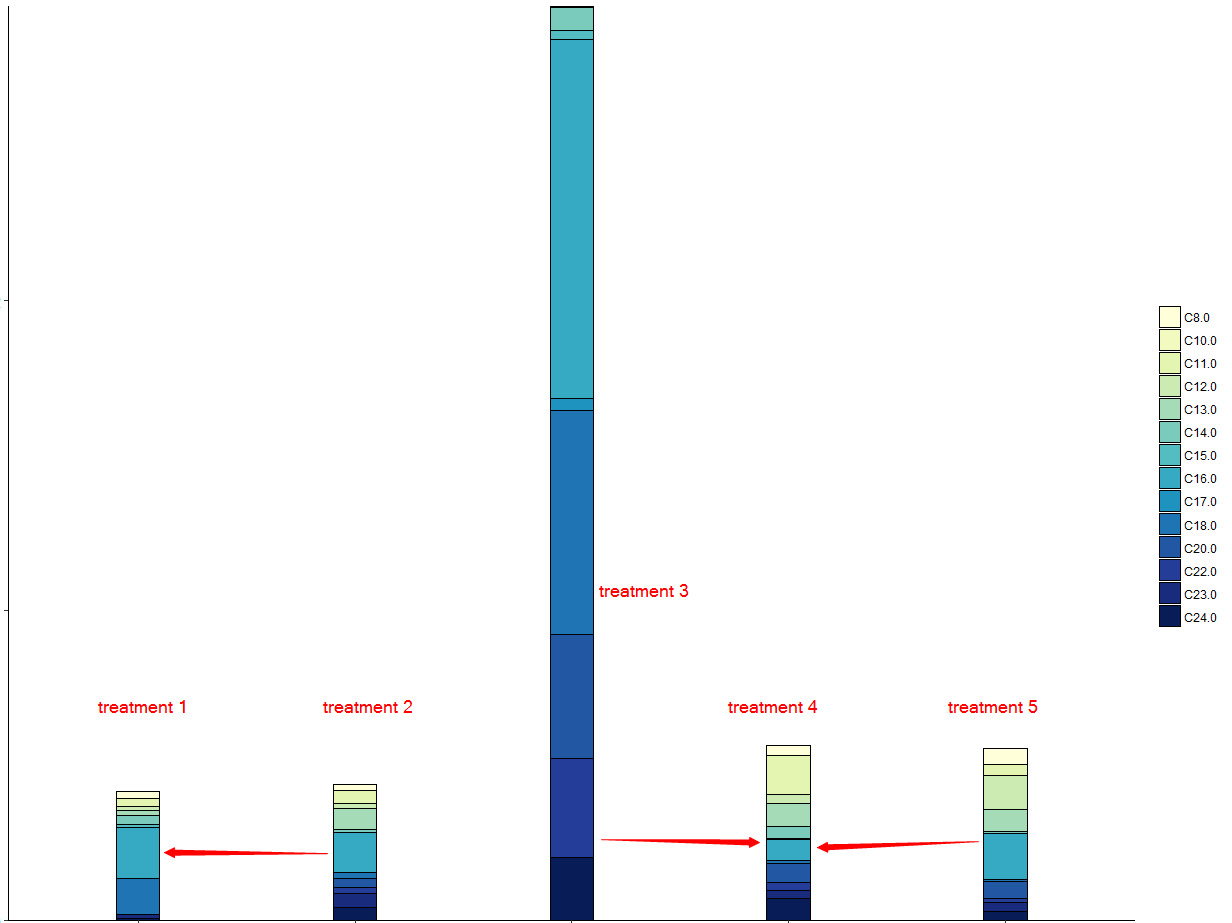 我想做一个图来比较这五种治疗方法,以及它们的测量方法。因此,我用堆栈条图来绘制,如下所示: