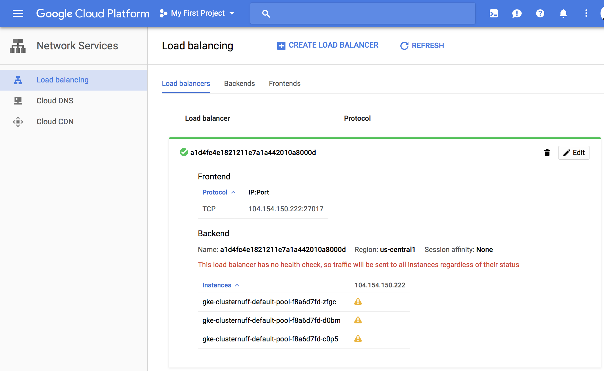 在这里,您可以看到一个负载平衡器的例子,我已经为我删除的集群设置了一个负载均衡器。