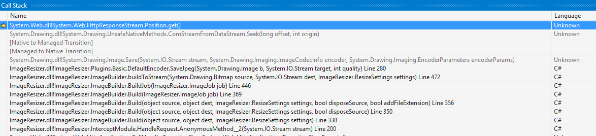 <diskcache dir="~/Content/Resize" enabled="false" />不幸的是,当请求图像时,什么都不会出现。启用所有异常后,我设法缩小到ImageResizer.Plugins.Basic中的这个例程