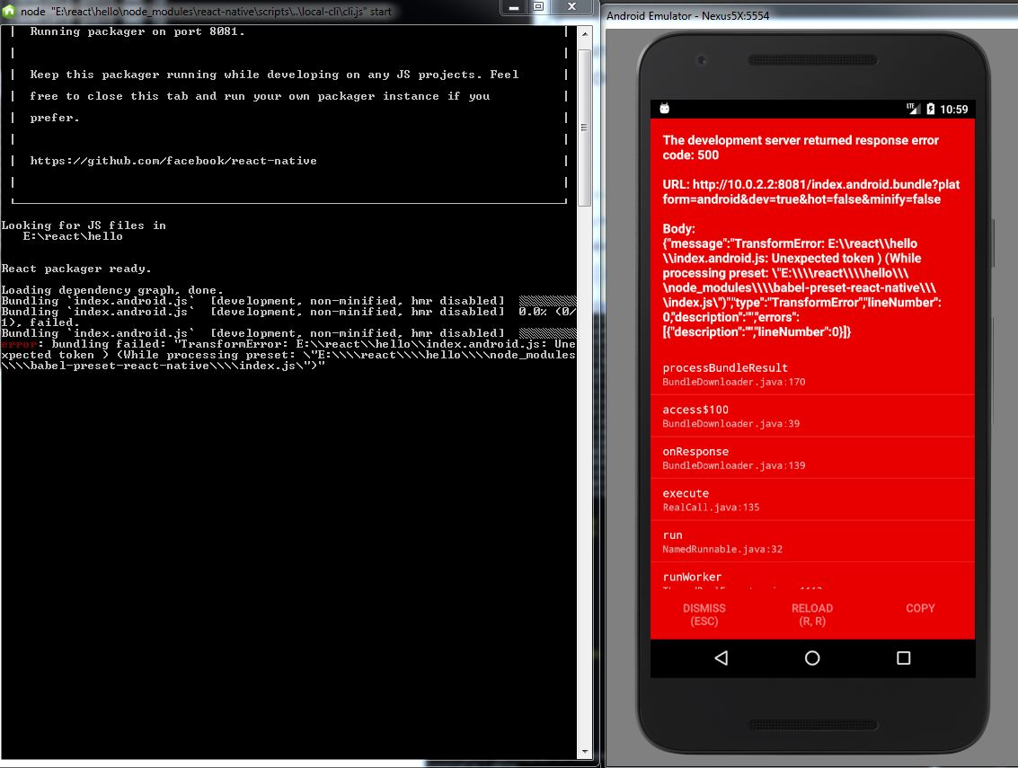 如果有人使用的是“反应-本机”:0.57.1或最新的“反应”,则“预置-反应-本机”已被“地铁-反应-本机-巴贝尔-预置”所取代。如果连接到设备时仍然有500个错误,请执行下面的步骤,我想一切都会好起来的。