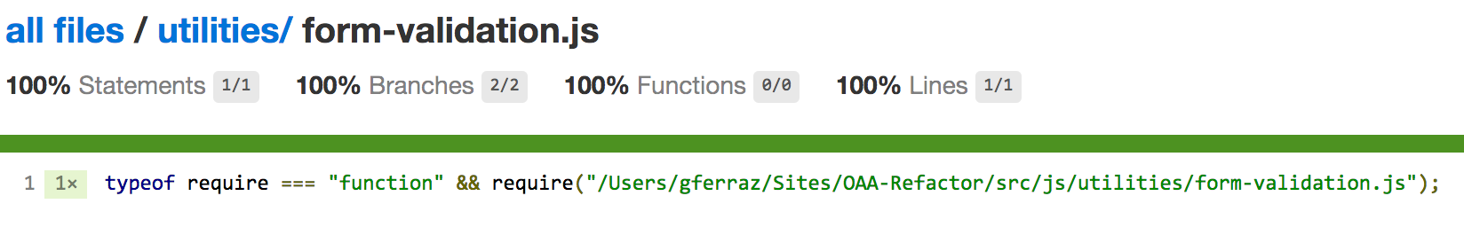 =============这显然是错误的,因为我在"form-validation.js“上有四个函数,我正在测试其中的两个函数。但根据总结报告,没有任何功能需要测试。