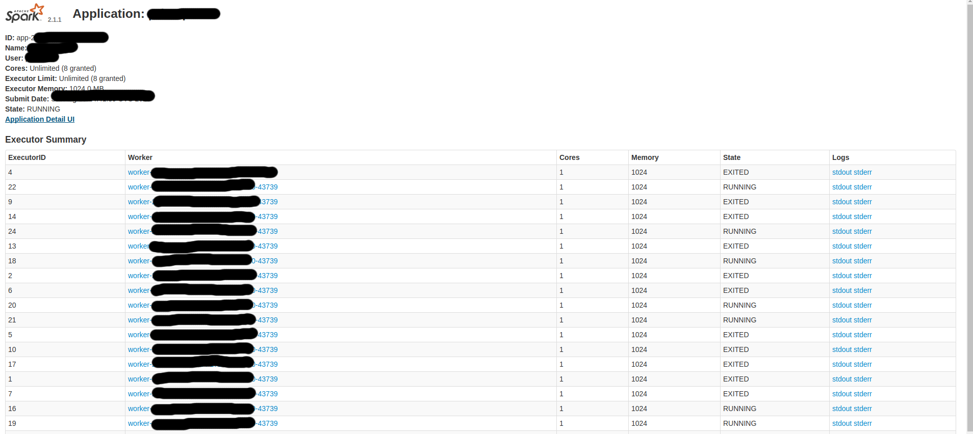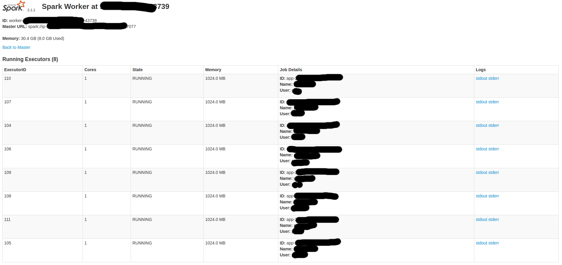 xx/xx/xx xx:xx:xx INFO Master: Launching executor app-xxxxxxxxxxxxxx-xxxx/xx on worker worker-xxxxxxxxxxxxxx-127.0.0.1-42524worker.log包含许多行,如: