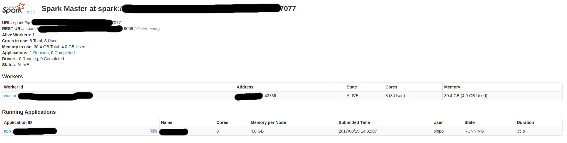 xx/xx/xx xx:xx:xx INFO ExecutorRunner: Launch command: "/usr/lib/jvm/java-8-openjdk-amd64/jre//bin/java" "-cp" "/usr/local/share/spark/spark-2.1.1-bin-hadoop2.7/conf/:/usr/local/share/spark/spark-2.1.1-bin-hadoop2.7/jars/*" "-Xmx4096M" "-Dspark.driver.port=34889" "-Dspark.cassandra.connection.port=9042" "org.apache.spark.executor.CoarseGrainedExecutorBackend" "--driver-url" "spark://CoarseGrainedScheduler@127.0.0.1:34889" "--executor-id" "476" "--hostname" "127.0.0.1" "--cores" "1" "--app-id" "app-xxxxxxxxxxxxxx-xxxx" "--worker-url" "spark://Worker@127.0.0.1:42524"如果您想要的话,请使用这是个吉斯特,其中包含我在上面放置的日志行。