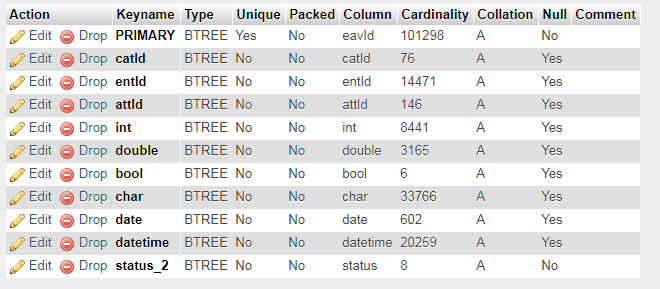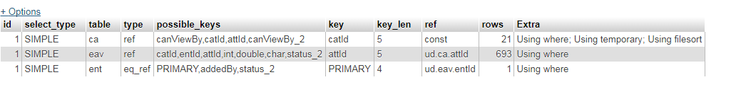当我运行这个查询时,平均花费了1.2421秒,我认为这很慢,我在WHERE子句中为每个可能的列添加了索引。所以我还可以做更多的改进来加速这个查询吗?包含大多数数据的表是eav,它有大约111276行/记录。