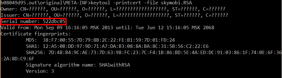我正在用.APK从安卓雄卫文件中提取功能,现在我需要从它的签名文件(通常是CERT.RSA)中提取序列号(*)。我已经找到了asn1crypto,但我不太明白如何在pkcs7中使用它。那么,是否有适合用于此目的的python包?