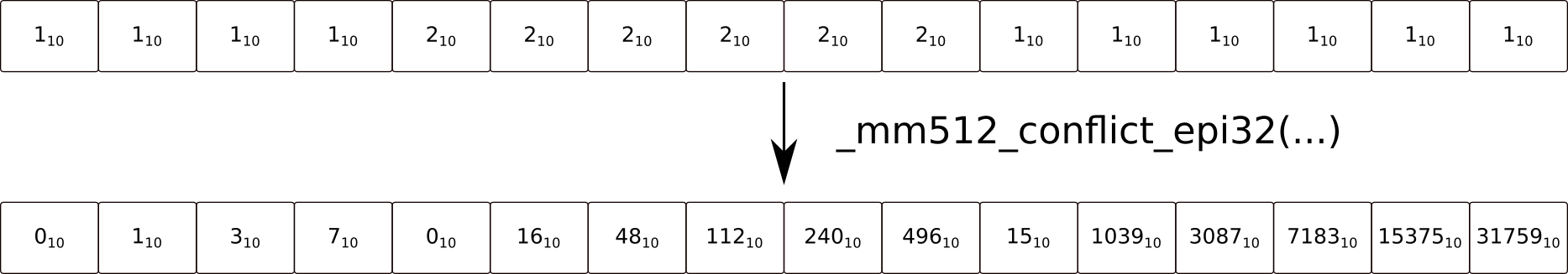 __m512i out = _mm512_conflict_epi32(in);现在我们得到: