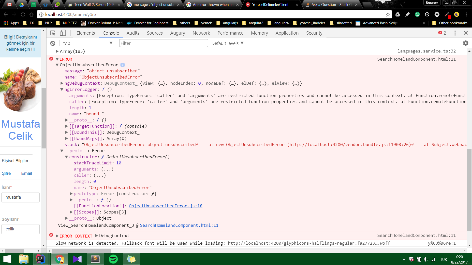 我猜由ReactJs rxjs/Subject属性引起的问题。我想,我可能会取消一些错误,但我的取消订阅代码是在ngOnDestroy()方法,这是退出的代码。