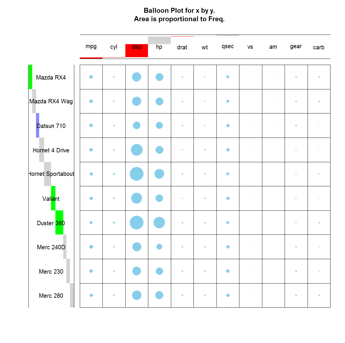 balloonplot(t(dt), xlab ="", ylab="", label = FALSE, show.margins = FALSE)我可以用任意颜色来改变灰色条形图(x和y)的颜色吗?例如,我想要mpg,cyl,disp和drat在红色,所有其他的蓝色。