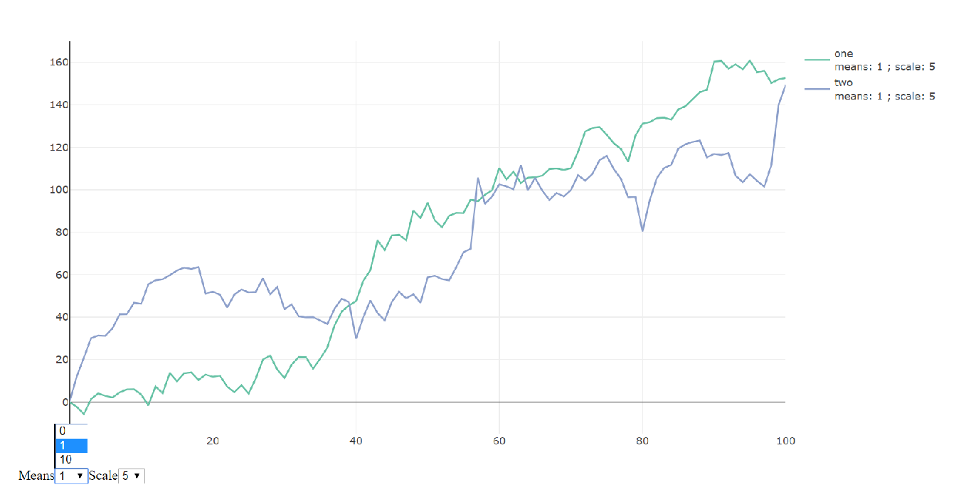 add_trace(x=0:sample.size,y=c(0,cumsum(means[i]+scales[j]*rnorm(sample.size))),type='scatter',mode='lines',color='one', visible = tt.visible) %>%