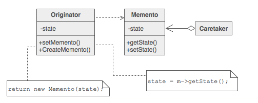 }实现类是private,在Originator之外,实例只能被看作是Memento (请参阅函数签名),这样就无法访问状态。