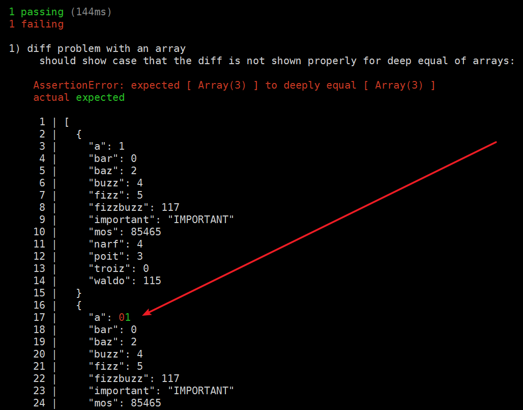 "fizz": 5使用Louis的答案修改chai也不会更好,因为它只会先转储整个实际数组,然后显示无帮助的差异: