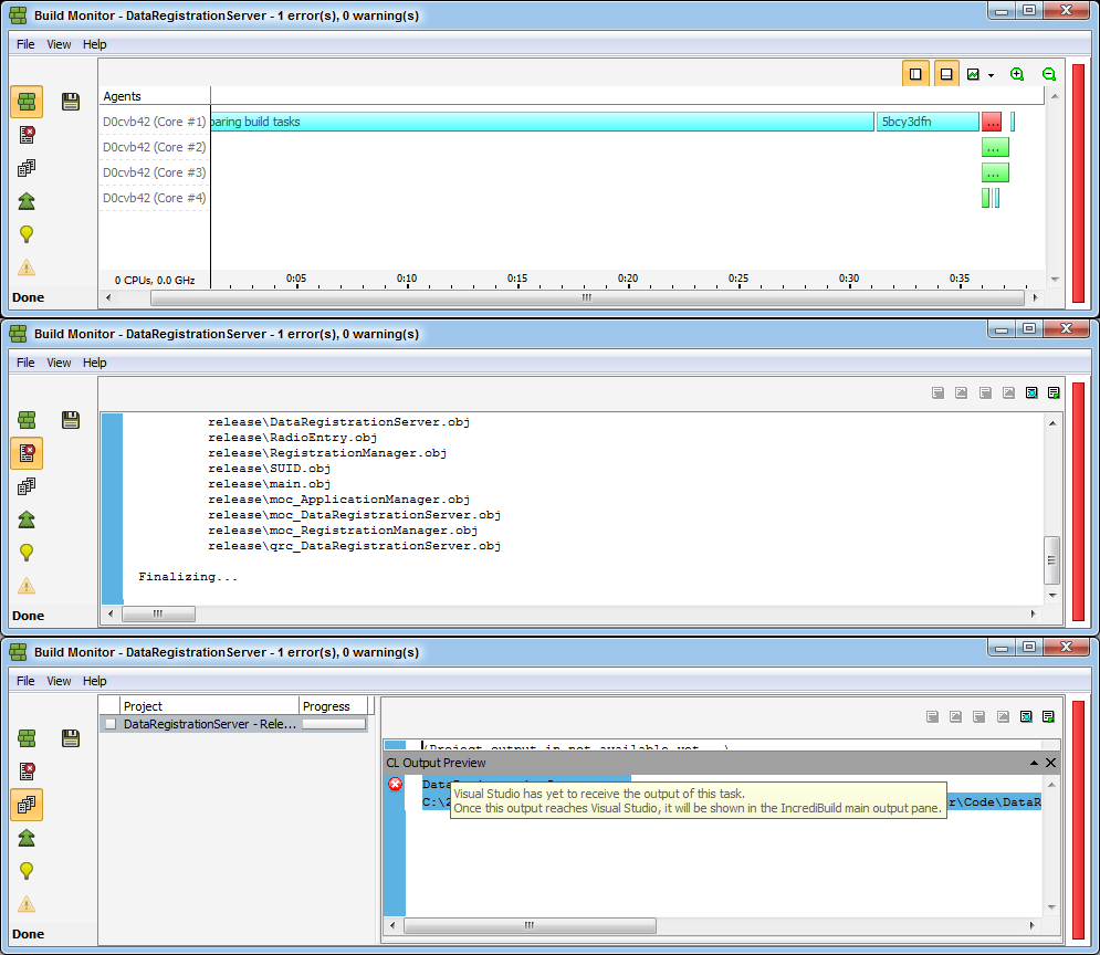 Visual尚未接收此任务的输出。一旦此输出到达Visual,它将显示在IncrediBuild主输出窗格中。
