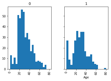 train_data.hist(column='Age',by='Survived',stacked=True,bins=20)