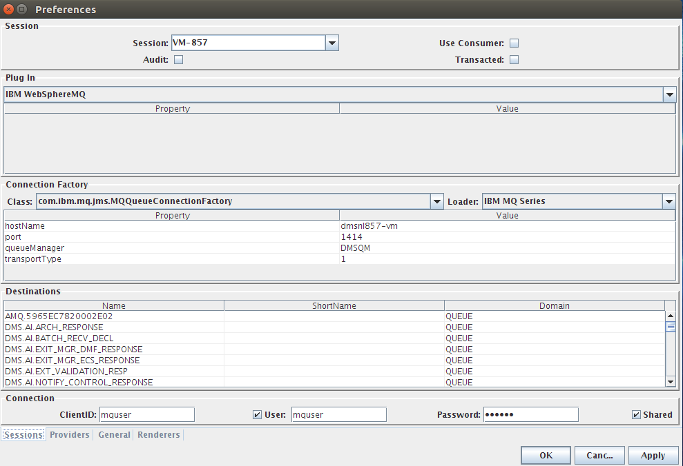 我在HermesJMS上找不到很多文档,但是通过一些尝试和错误,我发现如果单击“发现”,它不符合User和Password设置,它将始终将您登录的用户发送到队列管理器,这就是为什么您没有看到用户mquser。由于您以用户pkaramol的身份运行它,而在运行队列管理器的服务器上不存在该用户pkaramol,因此您将收到以下错误: