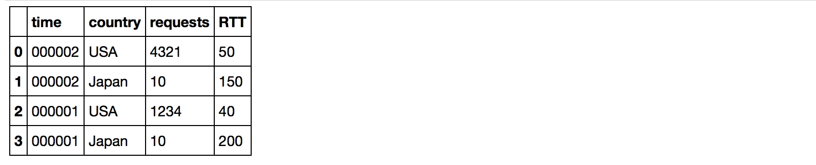 pd.DataFrame(lst, columns=['time', 'country', 'requests', 'RTT'])