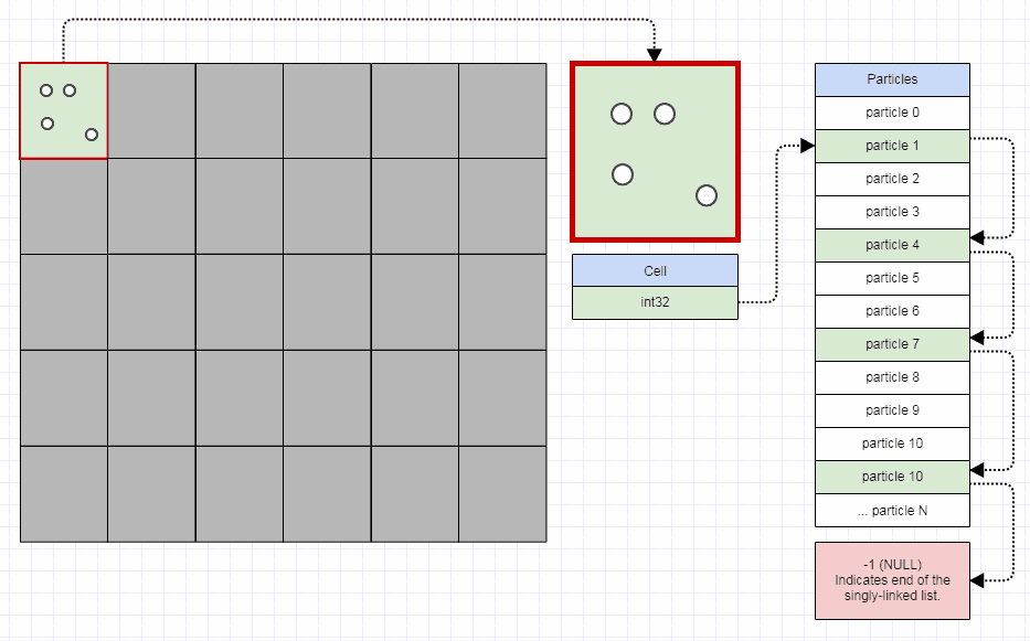 网格中的每个单元格应该只将一个索引存储到一个粒子中,每个粒子存储一个指向单元格中下一个粒子的索引(一个单链列表,但一个侵入式的索引,它不需要分配节点,只需要将索引用于数组)。-1可以用来表示列表的末尾和空单元格。