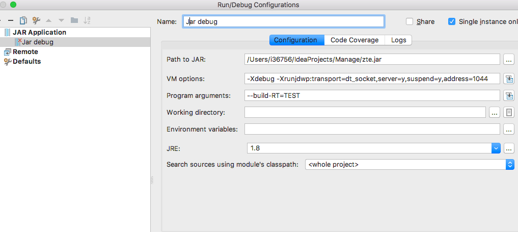 我使用下面的配置--我的根项目下的调试jar文件,当我点击调试程序开始运行,但没有停止,因为我没有设置任何断点(因为这是jar文件:),在node.js中,有一个选项可以使用--inspect-brk 信息来完成它,它在第一个语句上停止,但不确定如何在jar文件上执行。