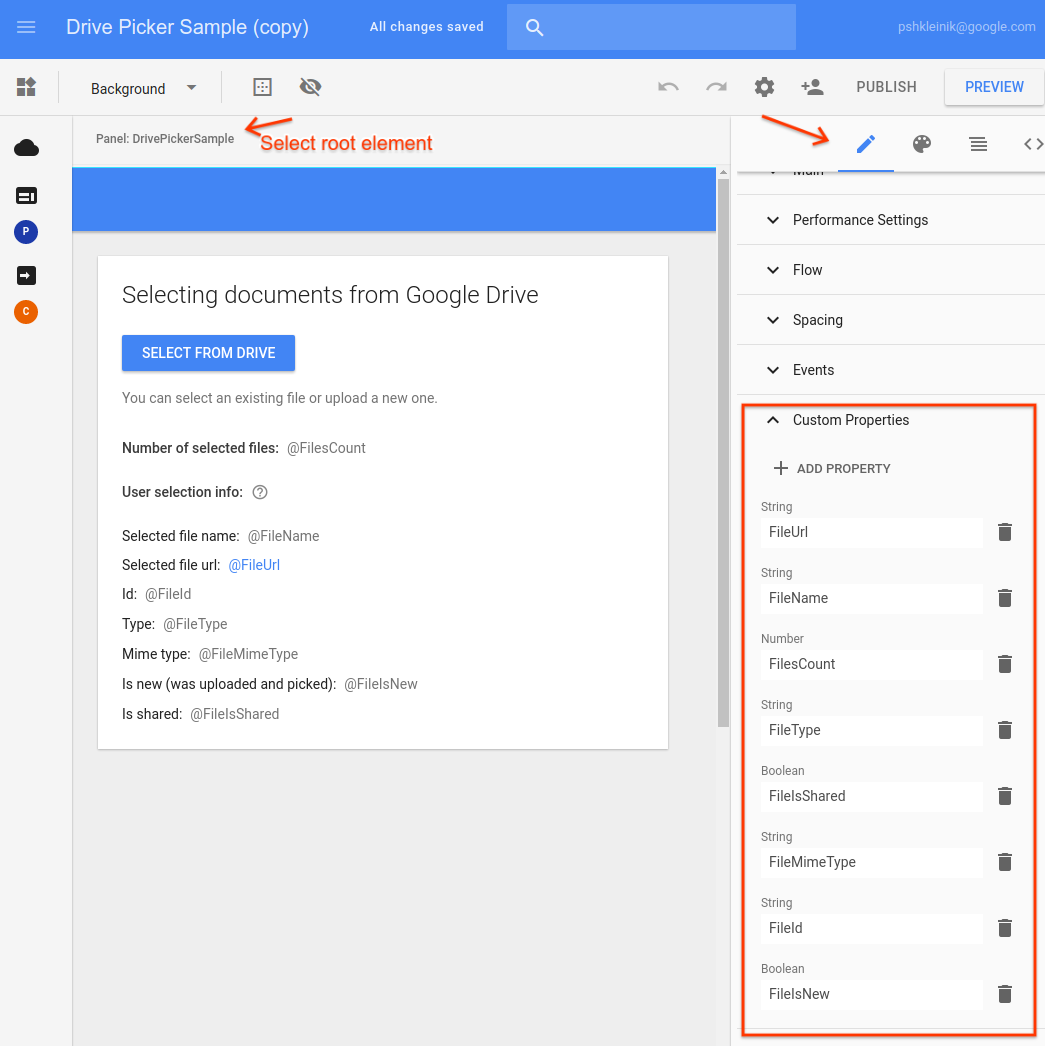但在现实应用程序中,最有可能的情况是,您需要将Drive Picker的属性绑定到某些数据源项字段(因此请确保您的Drive Picker小部件继承了正确的数据源)。