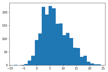 x2 = np.random.normal(loc=10, scale=5, size=1000)