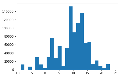 x = np.hstack((x1,x2))x的直方图如下所示: