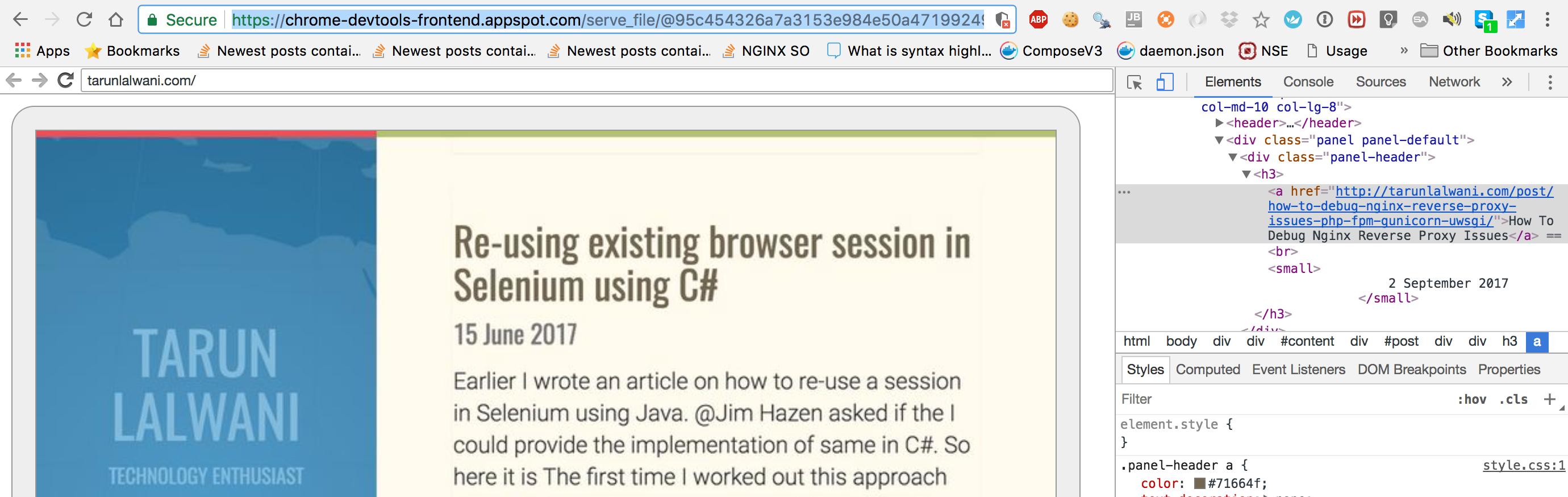 chrome --headless --remote-debugging-port=9222 --disable-gpu http://tarunlalwani.com现在,在打开另一个铬和调试网站,转到http://127.0.0.1:9222和检查网站。