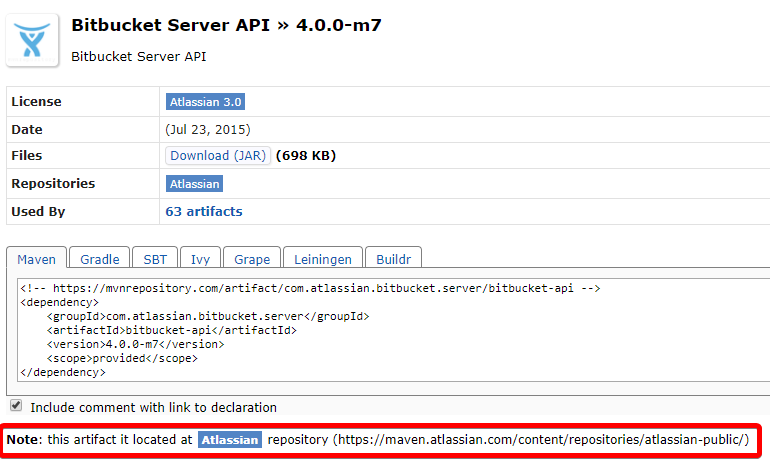 [WARNING] The POM for com.atlassian.bitbucket.server:bitbucket-api:jar:4.0.0-m7 is missing, no dependency information available
