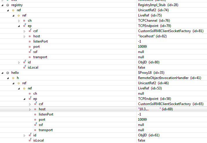 HelloRemote hello = (HelloRemote) registry.lookup(HelloRemote.class.getSimpleName());在调试器中,我可以看到主机类似于Registry,而不是Stub上的: