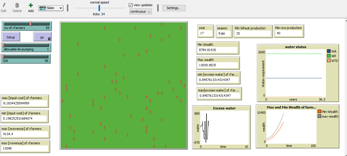 嗨,我想为一年内农民种植的时间表建立一个模型,并更新农民年收入、财富、可用水、用水etc.For,这是我尝试建立的一个模型,考虑了之前对这篇文章的答复。我需要彻底解决这个问题。如果我把我的代码中的水作为一个全局变量。我的最大和最小值的水被改变,但它保持不变的时候,我停止了模型。但是根据建议,如果我把多余的水作为农民拥有的,那么过剩水图表就会显示出一条恒定的线和一个恒定的最大和最小的水。我需要看到波动,虽然我已经尝试将用水纳入我的model.Expected输出,我的模型将主要是水的使用/访问-水,地下水和地面water.Please建议修正。谢谢
